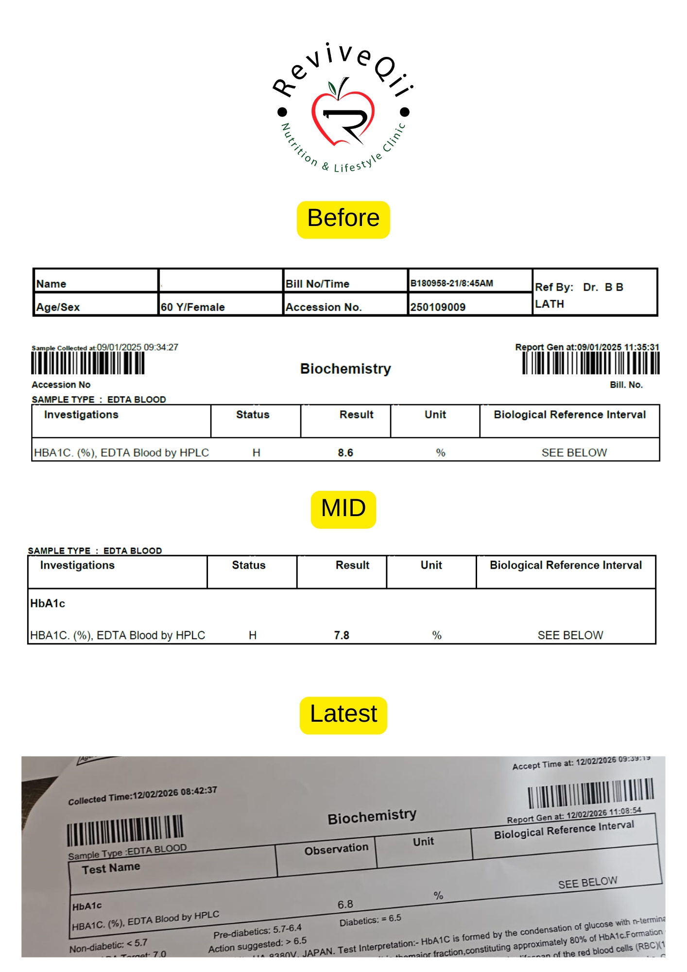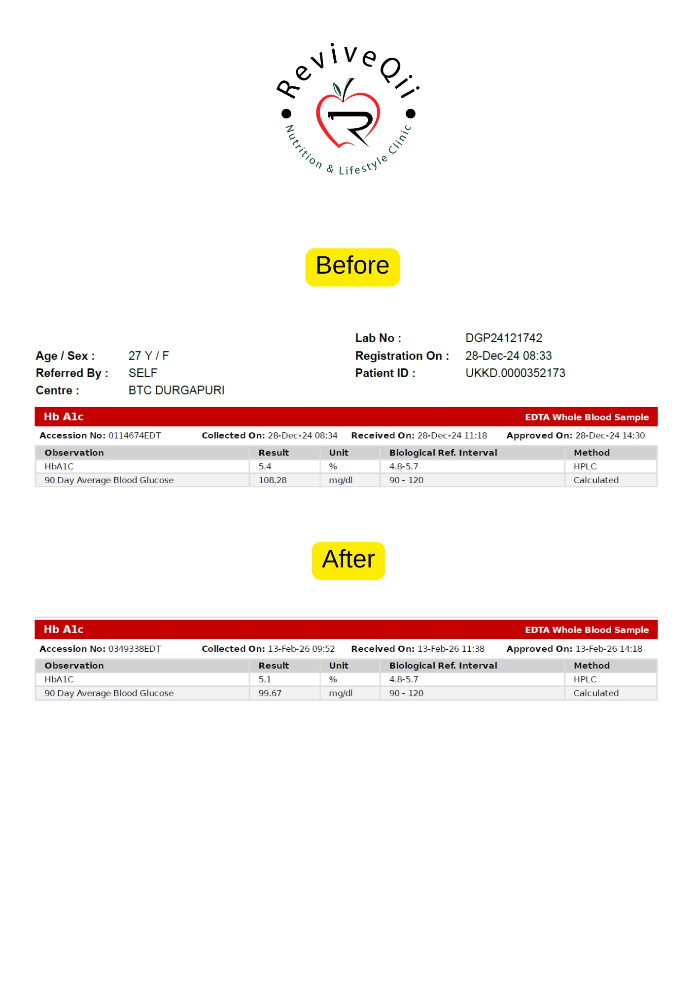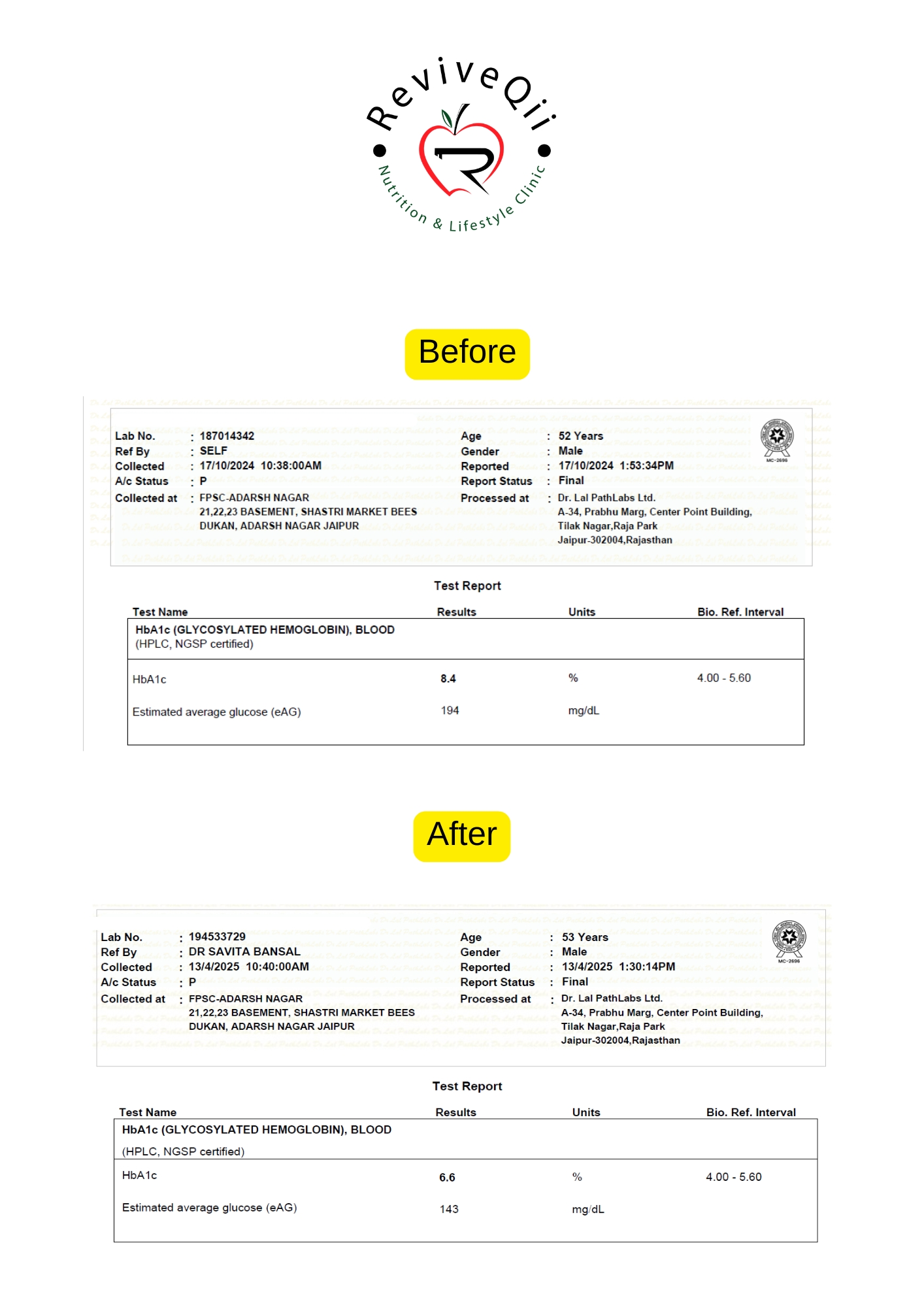 Health improvements documented through medical reports showing better blood sugar levels, weight reduction, improved metabolism, and overall wellness progress achieved.