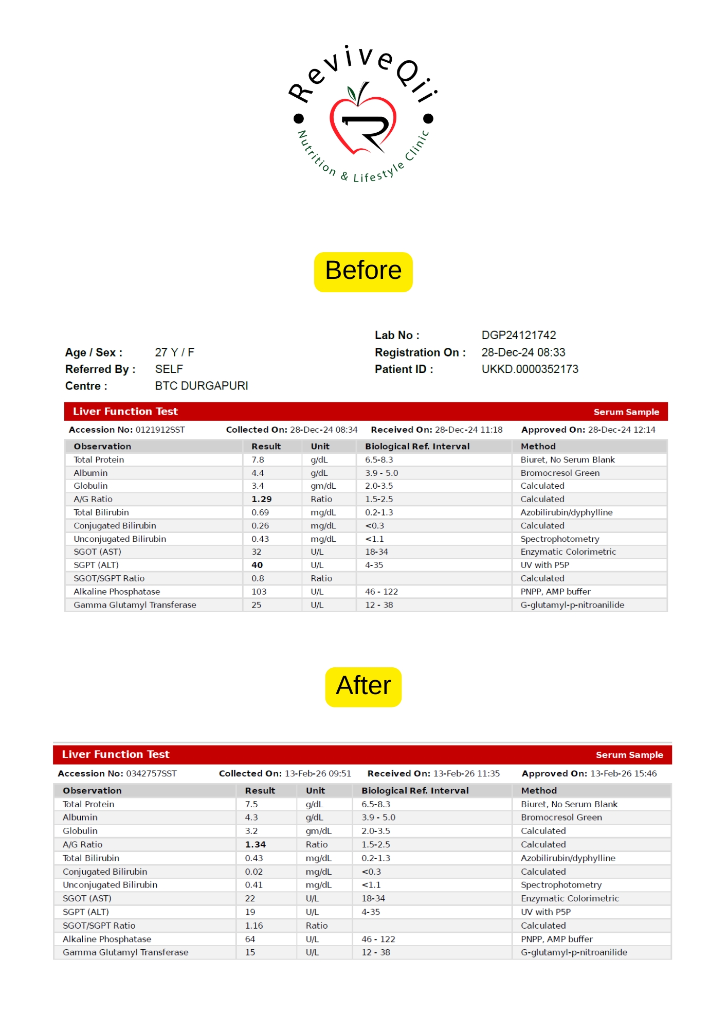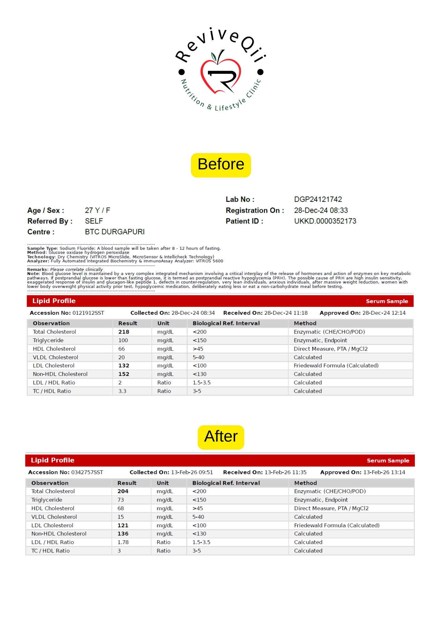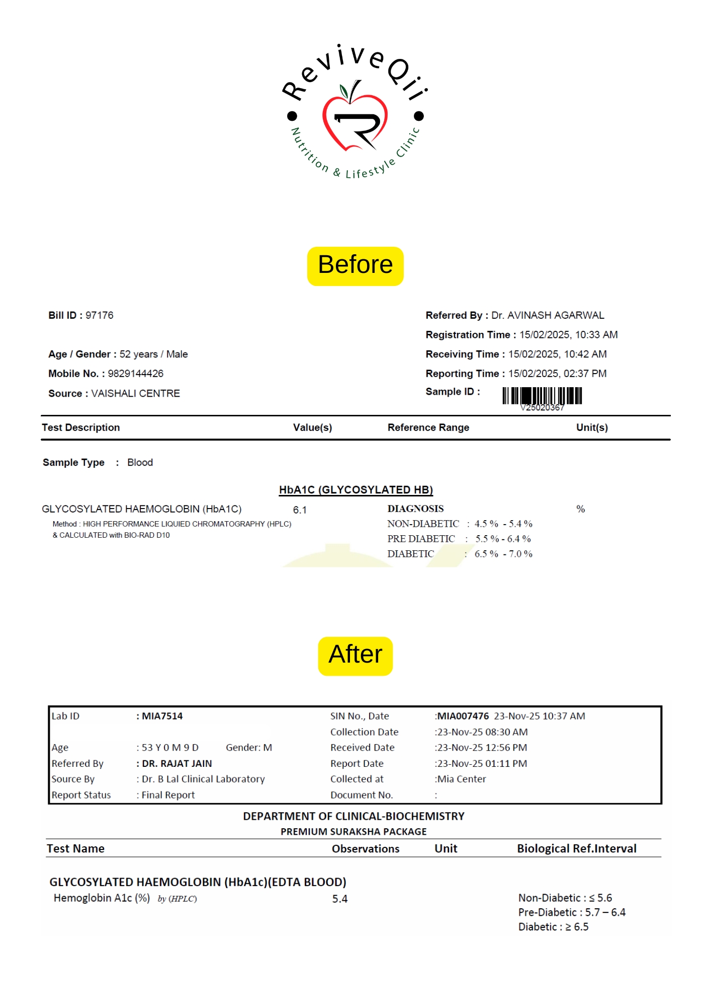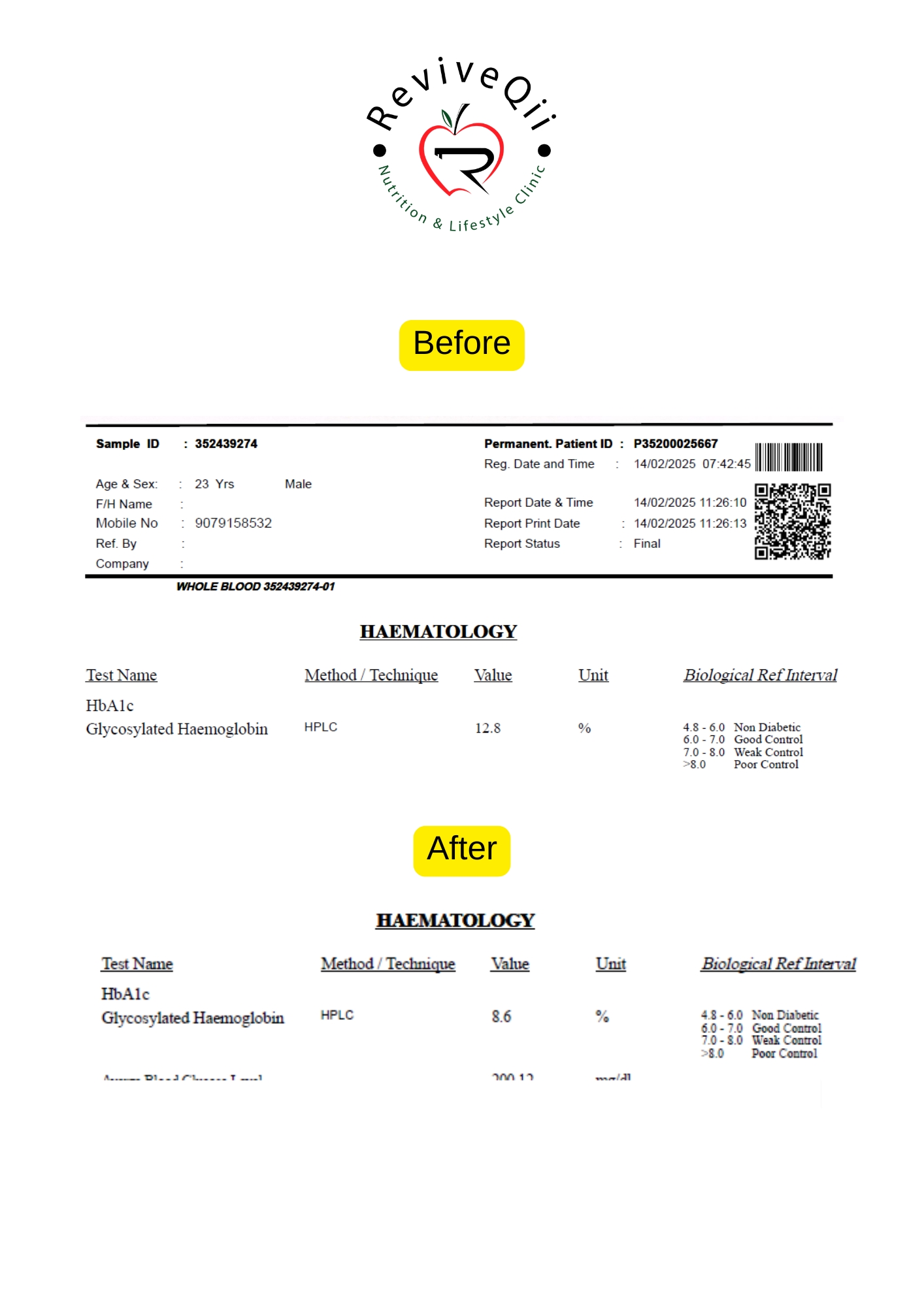 Health improvements documented through medical reports showing better blood sugar levels, weight reduction, improved metabolism, and overall wellness progress achieved.